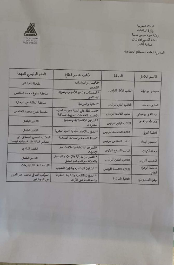 صوت أعضاء المجلس الجماعي لجماعة أكادير على لائحة نواب رئيس المجلس عزيز أخنوش الذي انتخب يوم الخميس 23 شتنبر الجاري, على هرم رئاسة الجماعة.