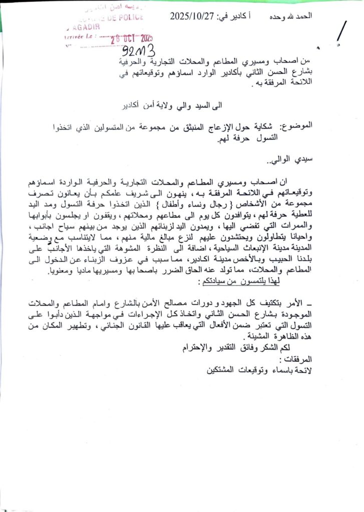 وجه عدد من أصحاب ومسيري المطاعم والمحلات التجارية والحرفية بشارع الحسن الثاني في أكادير، شكاية رسمية إلى والي أمن أكادير، يطالبون فيها بالتدخل العاجل للحد من ظاهرة التسول المنتشرة بشكل لافت أمام محلاتهم، والتي باتت ـ بحسبهم ـ تُسيء إلى صورة المدينة وتؤثر سلبًا على نشاطهم التجاري والسياحي.