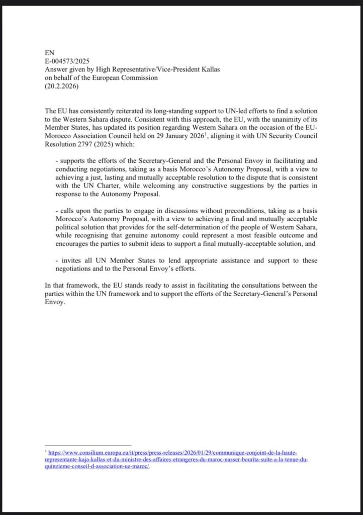 وجاء الإعلان عن هذا الموقف الموحد على لسان كايا كالاس، الممثلة العليا للاتحاد الأوروبي للشؤون الخارجية والسياسة الأمنية، في ردها على استفسار كتابي تقدمت به النائبة الأيرلندية لين بويلان، المعروفة بقربها من أطروحات البوليساريو. وأوضحت كالاس، يوم أمس الجمعة، أن موقف الاتحاد الأوروبي جرى تحديثه ليتماشى مع مضامين قرار مجلس الأمن الدولي رقم 2797 لسنة 2025، وذلك خلال اجتماع مجلس الشراكة بين الاتحاد الأوروبي والمغرب الذي انعقد في التاسع والعشرين من يناير الماضي.