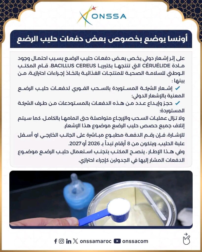 أعلن المكتب الوطني للسلامة الصحية للمنتجات الغذائية عن سحب احترازي لعدد من دفعات حليب الرضع المتداولة ، بعد توصلها بإشعار دولي يفيد باحتمال احتواء بعض الدفعات على مادة السيروليد (Céruélide) التي قد تنتجها بكتيريا Bacillus cereus المرتبطة ببعض حالات التسمم الغذائي.