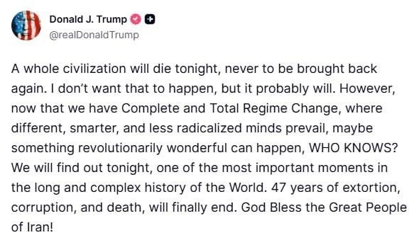 ترامب يهدد بمحو إيران: “حضارة كاملة قد تختفي الليلة”