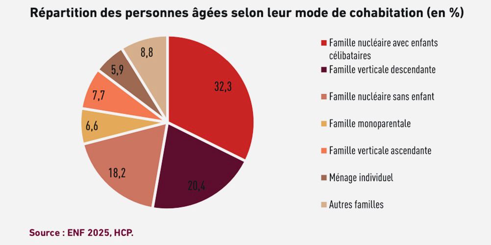 ورغم هذه التحولات، تظل الأسرة الإطار الأساسي لرعاية كبار السن، إذ يعيش 59.3 في المائة منهم مع أحد الأبناء. غير أن هذا الواقع يخفي هشاشة واضحة، حيث إن 31 في المائة من كبار السن بلا دخل، ولا تتجاوز نسبة من تغطي مداخيلهم احتياجاتهم الأساسية 9 في المائة، ما يبرز محدودية منظومة الحماية الاجتماعية.