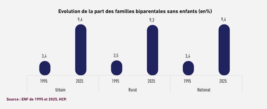 ومن أبرز التحولات أيضاً ارتفاع نسبة الأزواج الذين يعيشون دون أطفال إلى 9.4 في المائة بعد أن كانت 3.4 في المائة سنة 1995، وهو ما يرتبط بظاهرة «الأعشاش الفارغة»، حيث يشكل من تجاوزوا سن الستين أكثر من 72 في المائة من هذه الفئة، بما يعكس تسارع الشيخوخة داخل البنية الأسرية.