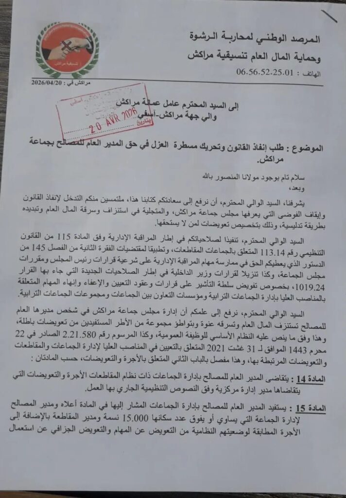 وجّه المرصد الوطني لمحاربة الرشوة وحماية المال العام ضربة قضائية وُصفت بالثقيلة إلى المجلس الجماعي لمدينة مراكش، بعد وضعه شكاية رسمية لدى والي جهة مراكش-آسفي، يتهم فيها مسؤولاً كبيراً بـ«سرقة موصوفة» طالت المال العام على امتداد أربعين شهراً متتالية.
