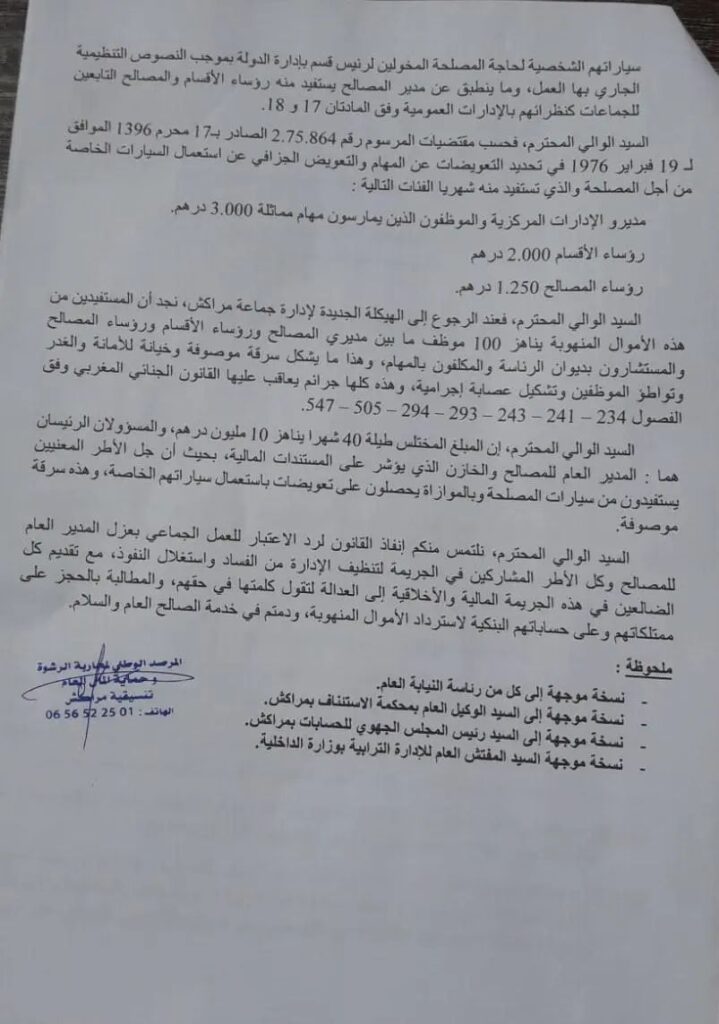 وأوضحت الوثيقة أن الهيكلة الإدارية الجديدة للمجلس تضم نحو 100 موظف يتقاضون تعويضات وُصفت بغير القانونية، في تناقض مع استفادتهم من سيارات المصلحة، وهو ما اعتبره المرصد «تبديداً للمال العام وتشكيل عصابة إجرامية وخيانة للأمانة»، مع الإشارة إلى أن هذه الاختلالات امتدت لما يقارب أربعين شهراً من الصرف غير المبرر.